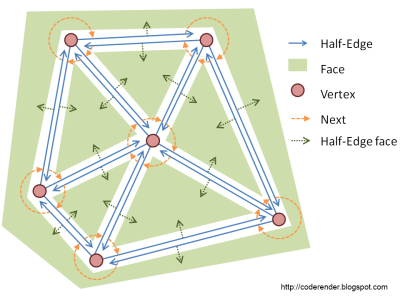 As you can see, it is easy to answer the questions from the beginning of the post. What are the edges that start on a given vertex? Pick the vertex. The first half-edge is in its incident pointer. Call it current. For the next half-edge, pick the previous->twin half-edge of the current half-edge (and call this new one the new current). Keep getting these previous->twin pointers until you reach the first half-edge, and you did it!!! What are the neighbor faces of one given face? This one I left as exercise ツ